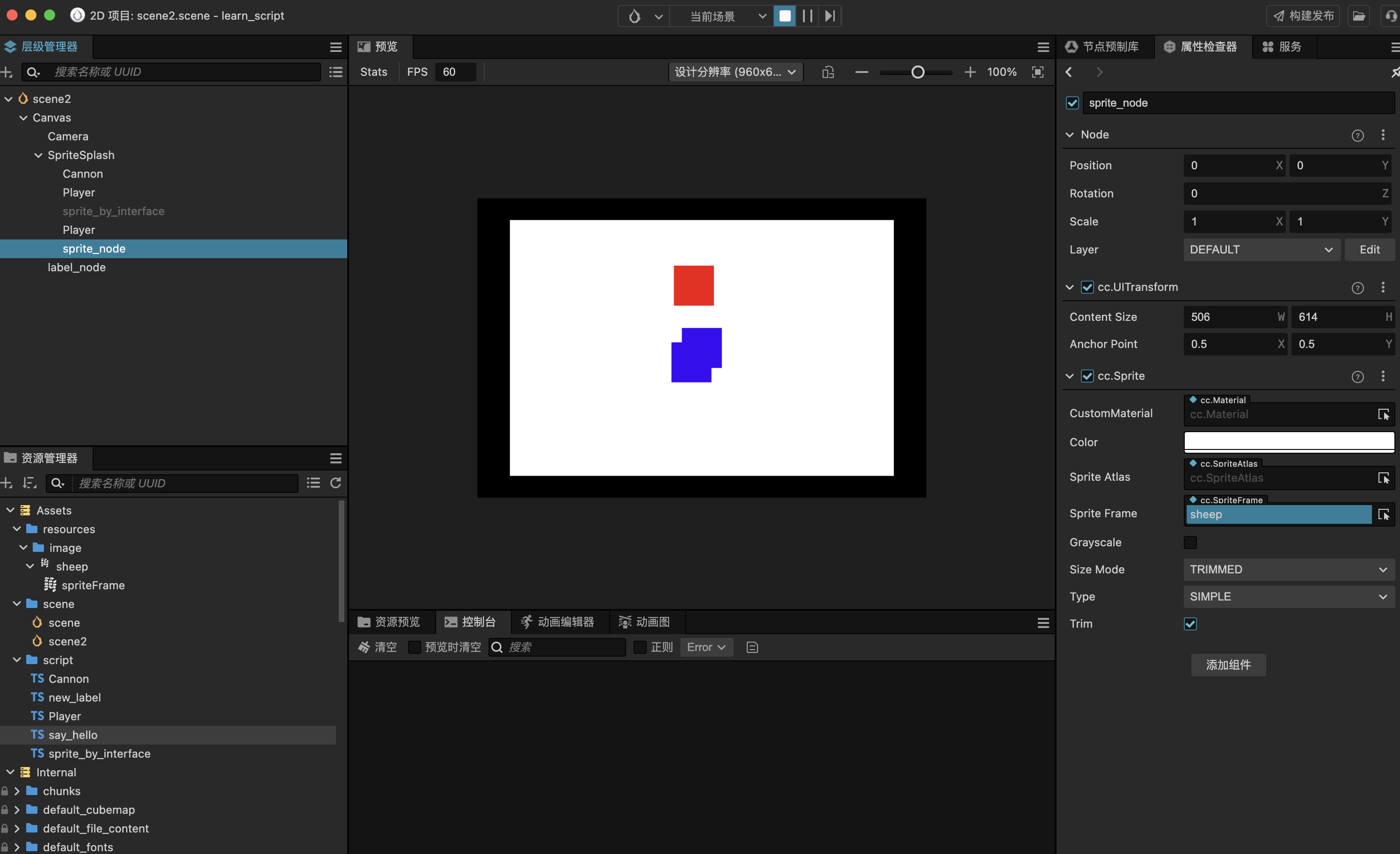在学习使用Cocos的过程中,尝试利用脚本组件在当前SpriteSplash节点上动态创建Sprite子节点,并加载resources下的PNG格式图片,在浏览器和模拟器预览中均无法显示加载的图片,且没有任何报错信息,但是通过log()可以看到该节点已经生成,且该节点已经被正确的放置到SpriteSplash的子节点中。