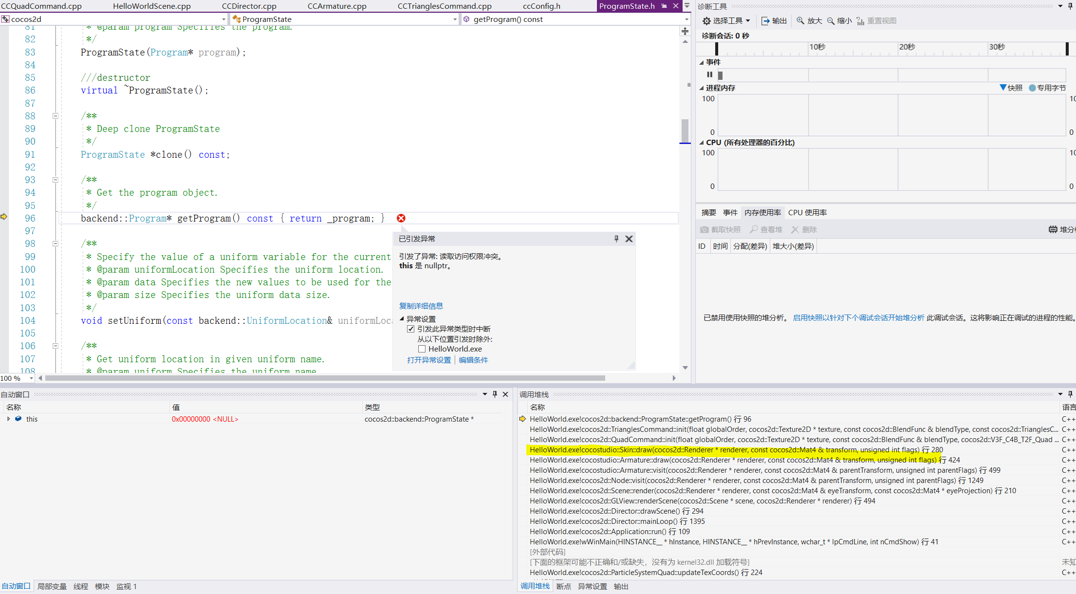 运行的时候在TrianglesCommand::init方法里报错了,报错位置是: