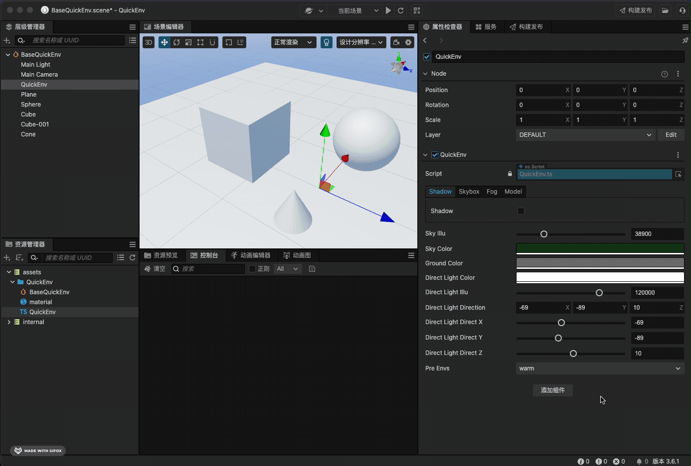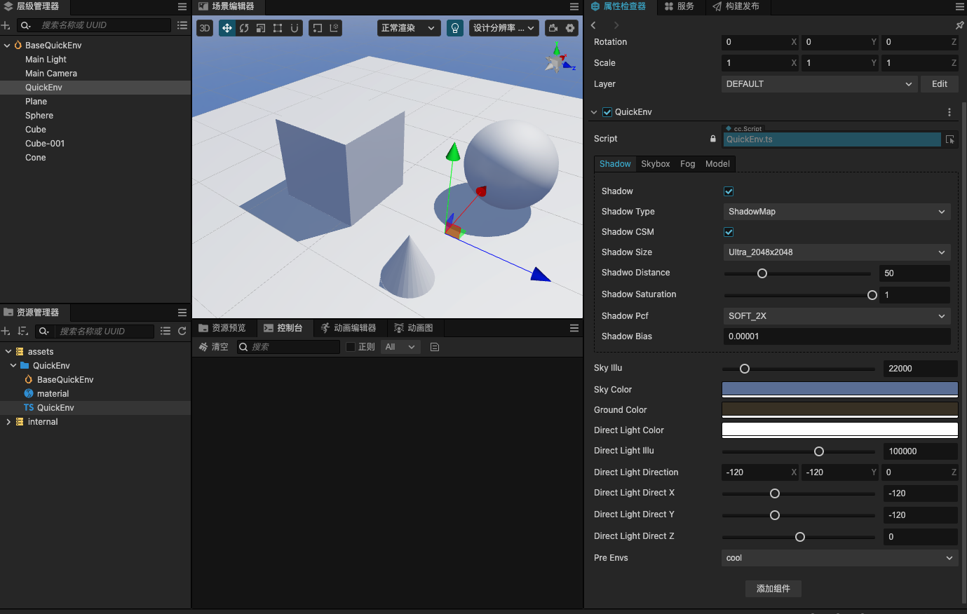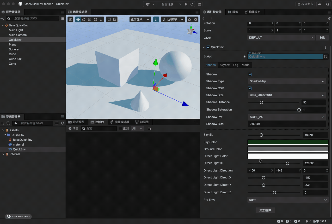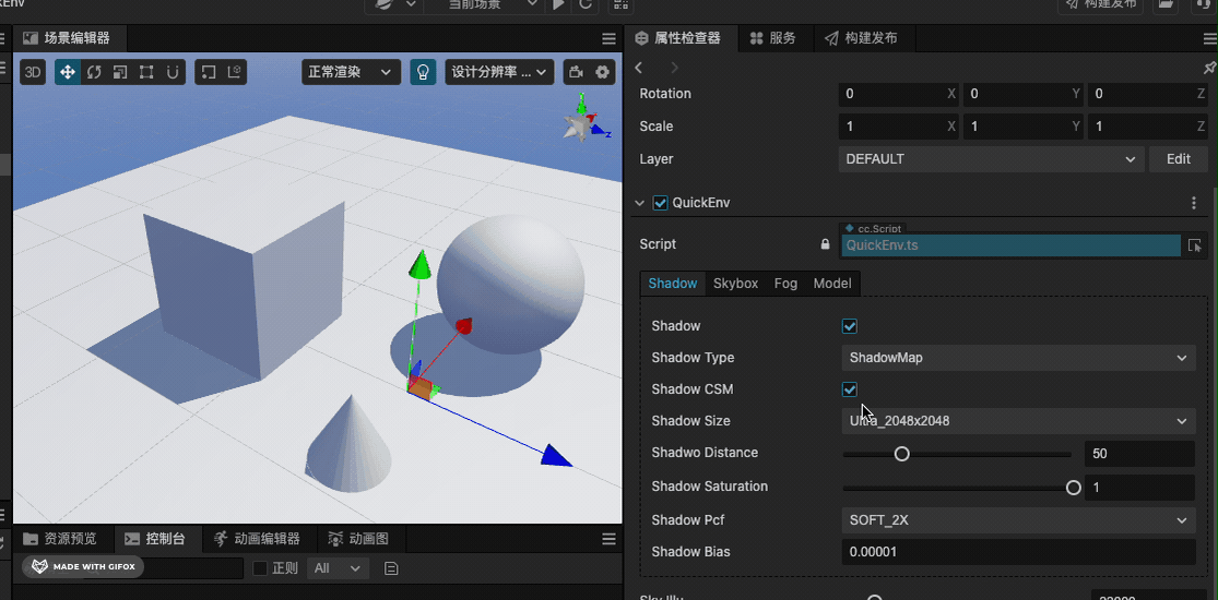 把常用的场景光照,颜色和阴影的设置功能全部暴露在面板,可以通过一个面板在编辑器进行开关
