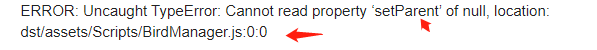 ERROR: Uncaught TypeError: Cannot read property ‘setParent’ of null, location: dst/assets/Scripts/BirdManager.js:0:0