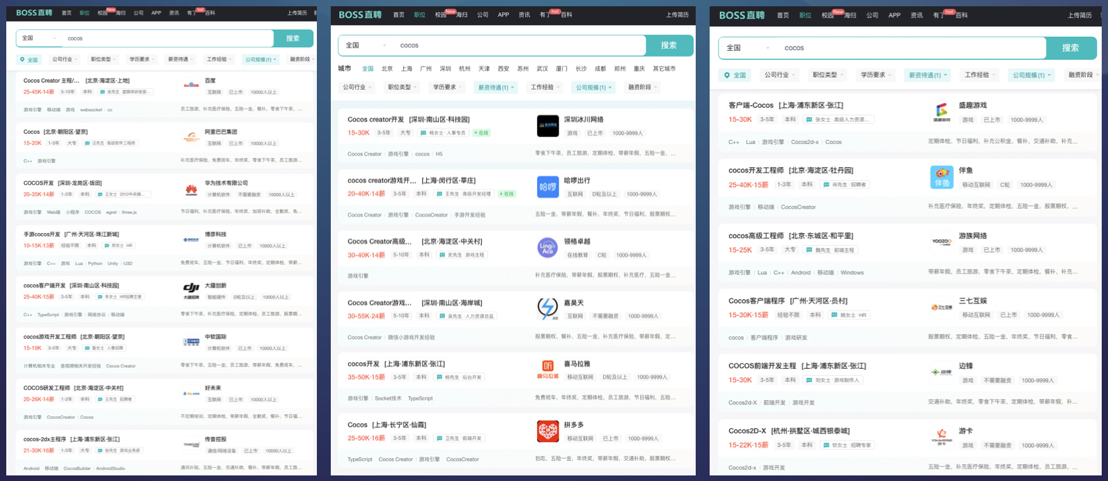 业内最近用 cocos 的姿势,很多都用在开发嵌在自己 APP 里的交互内容了,看看招聘就能知道风向了。这是我前天截的图: