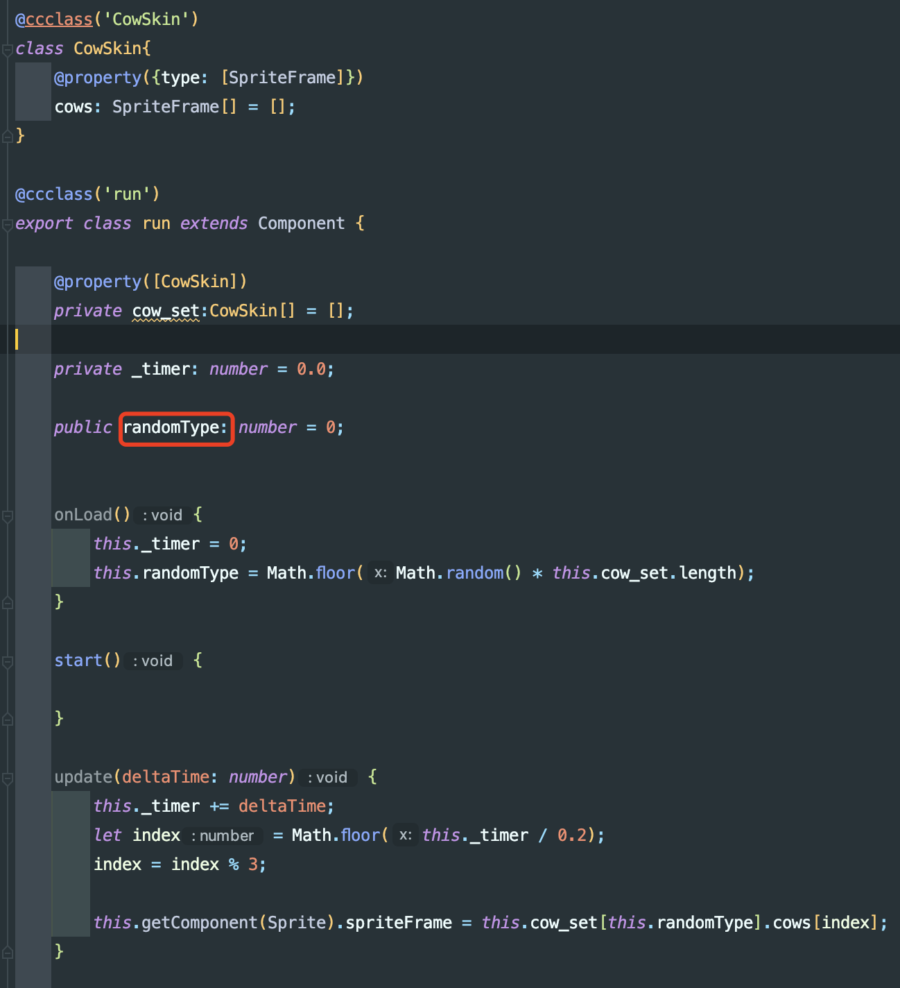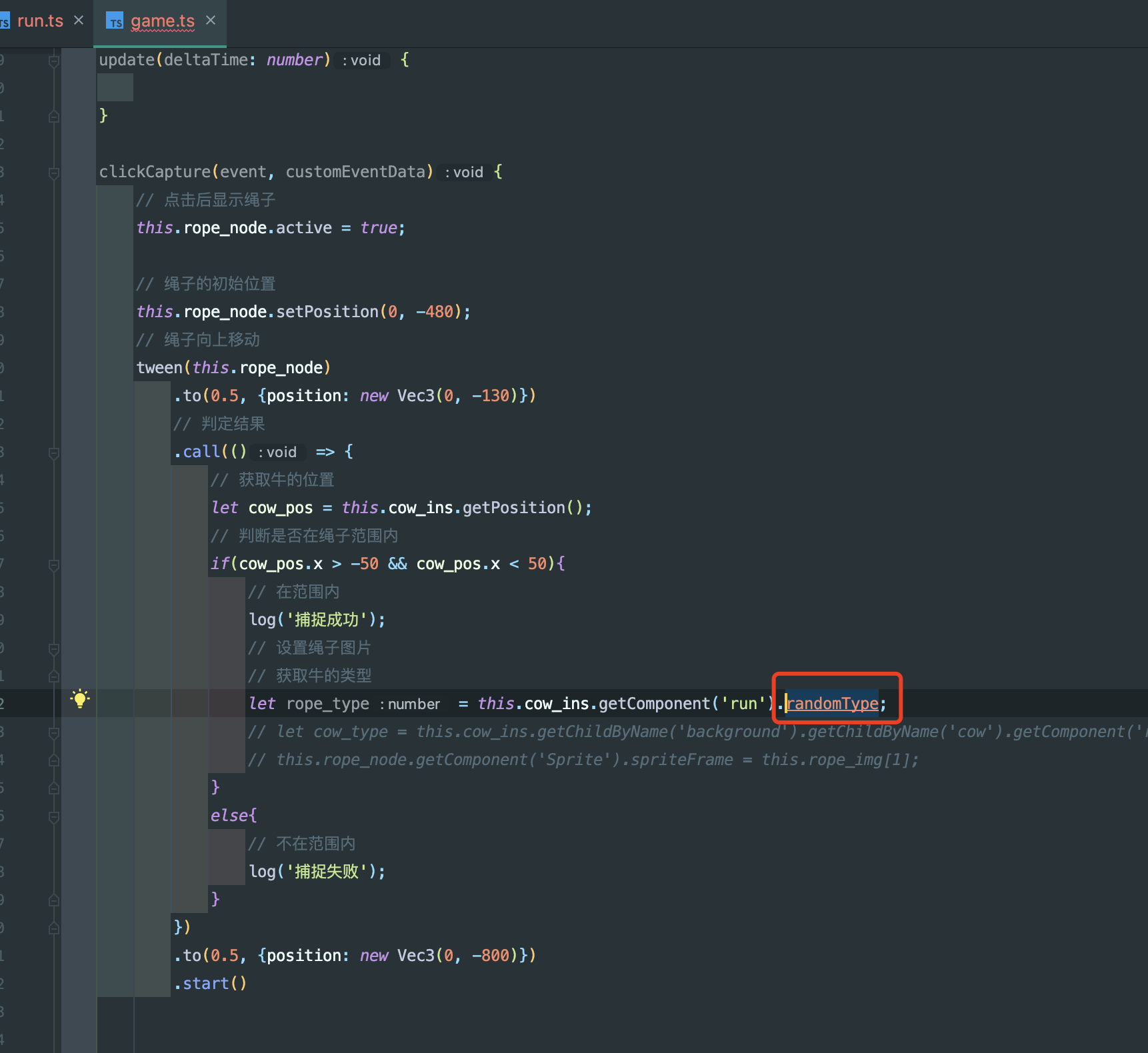 需要再“game”脚本中调用另一个脚本“run”中的变量randomType,但是无法正确调用。请大佬们帮忙看一下,什么地方写的不对,代码如下: