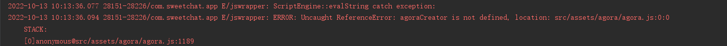在启动的时候,安卓端正常的初始化了Agora。 ServiceAgora serviceAgora = new ServiceAgora(); serviceAgora.init(this); js端找不到agoraCreator类,不知道哪里出了问题,我检查安卓工程文件,Agora相关的so文件都在。