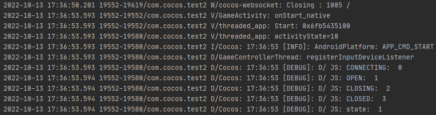 重现方式:搭建一个websocket服务器(我用的nodejs),在把运行的apk切到后台情况下,服务端主动关闭连接。这个时候会输出一个”Closing :1005“的log,切回到运行的apk发现客户端创建的websocket实例readystate为OPEN,并不能立刻知道websocket的断开状态,需要等一段时间(我测试发现大概在15-30s)。我使用cocos creator2.4.4也测试过,没有发现这个问题,能够立刻准确地知道websocket的断开状态。