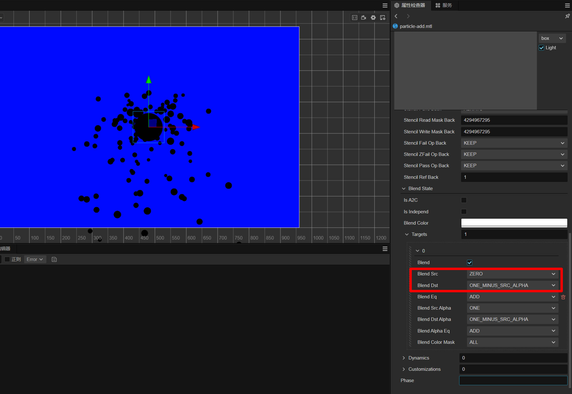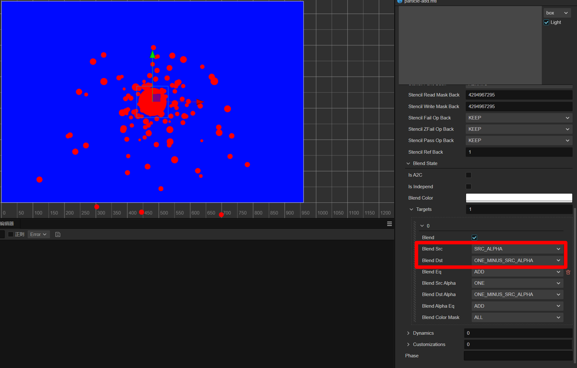我blend每个值都试了一遍,blendSrc和blendDst怎么修改,粒子系统表现出来的结果都是设置成SRC_ALPHA和ONE的结果