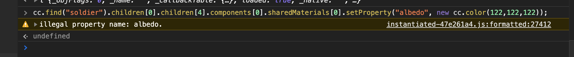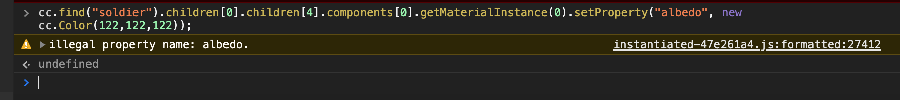 cc.find('soldier').children[0].children[4].components[0].getMaterialInstance(0).setProperty('albedo',new cc.color(122,122,22))