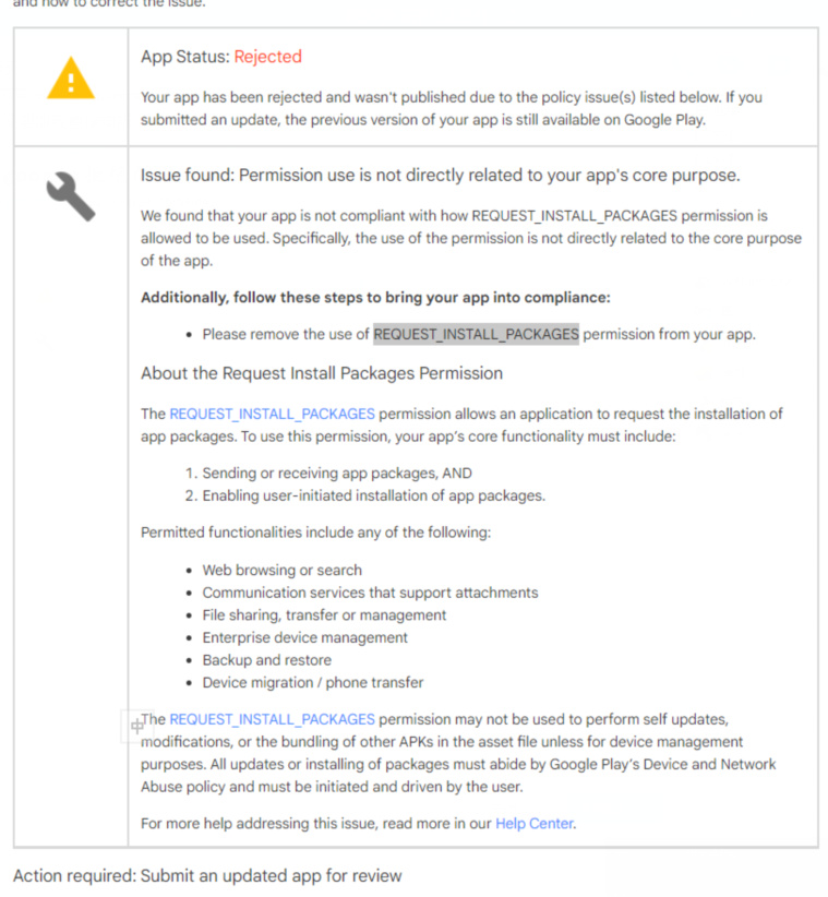 好像说app有REQUEST_INSTALL_PACKAGES这个权限,建议去掉再提审,但我这边已经去掉,并在清单里进行了屏蔽,但再次提审时还是以同样的原因拒绝了,有大佬知道原因或类似经验吗?求指导!!! 屏蔽代码如下: