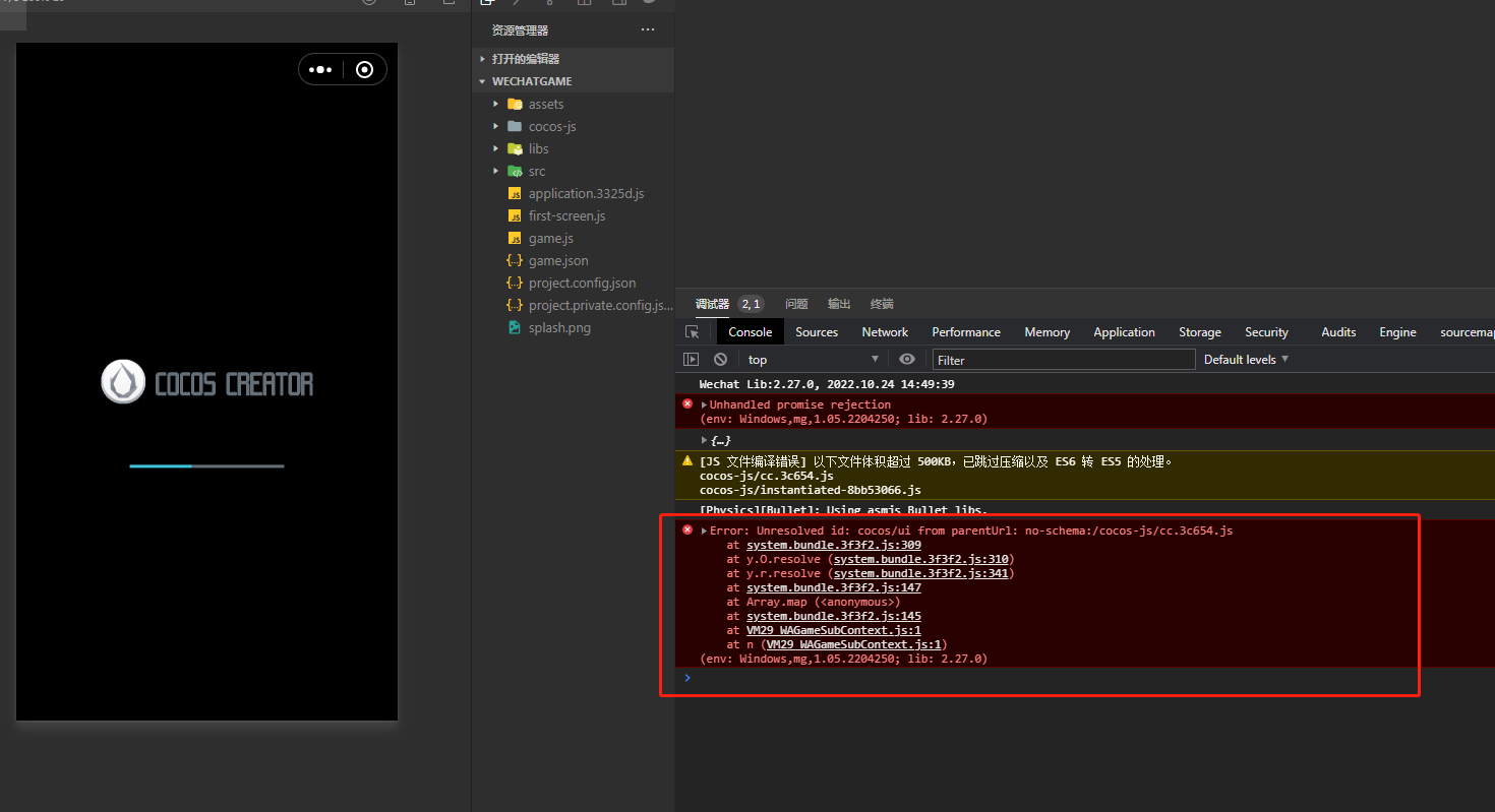 cocos版本 3.5.1 微信开发者工具版本 1.05.2204250 构建是正常的,但是导入开发者工具之后就报错了