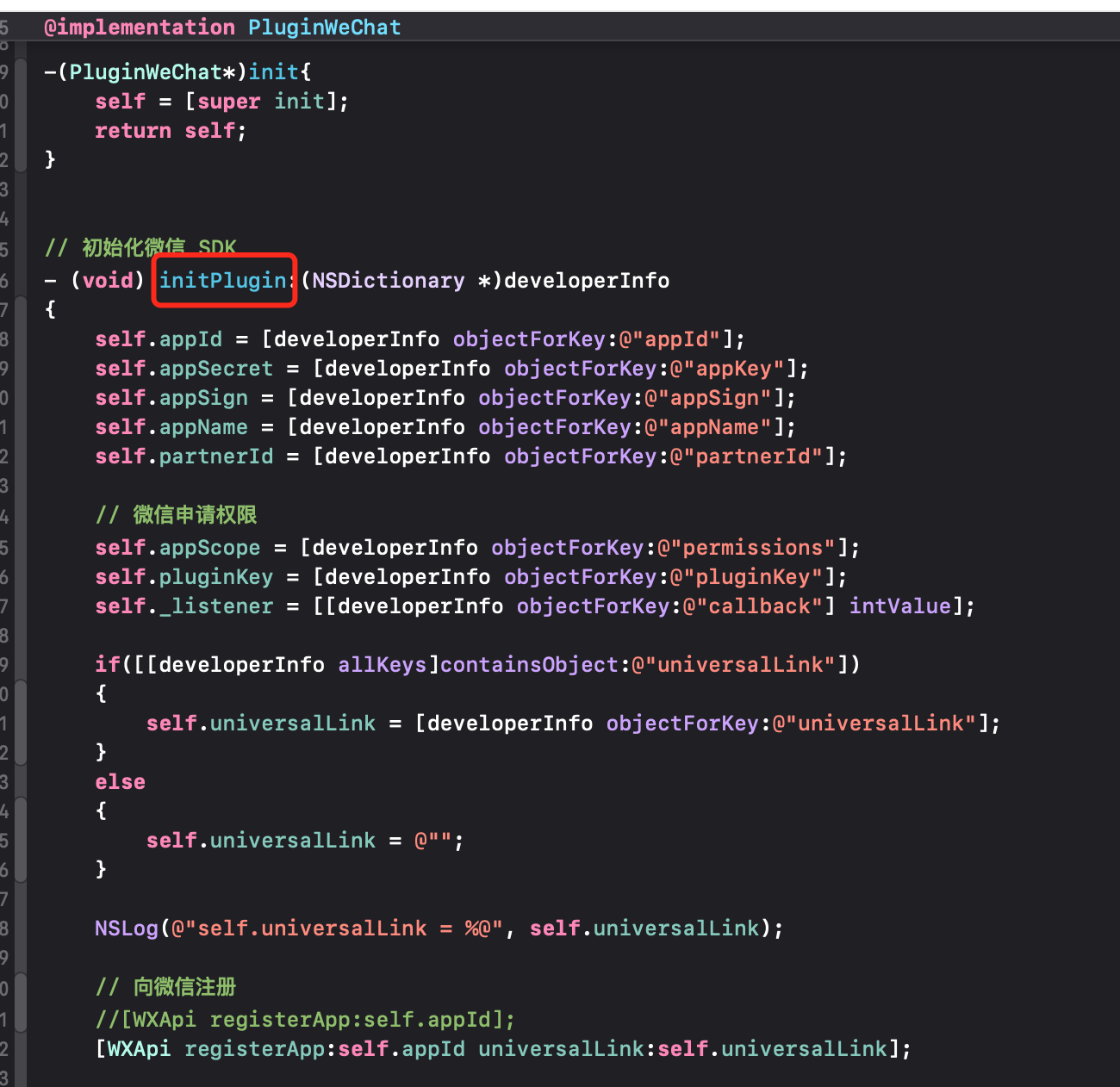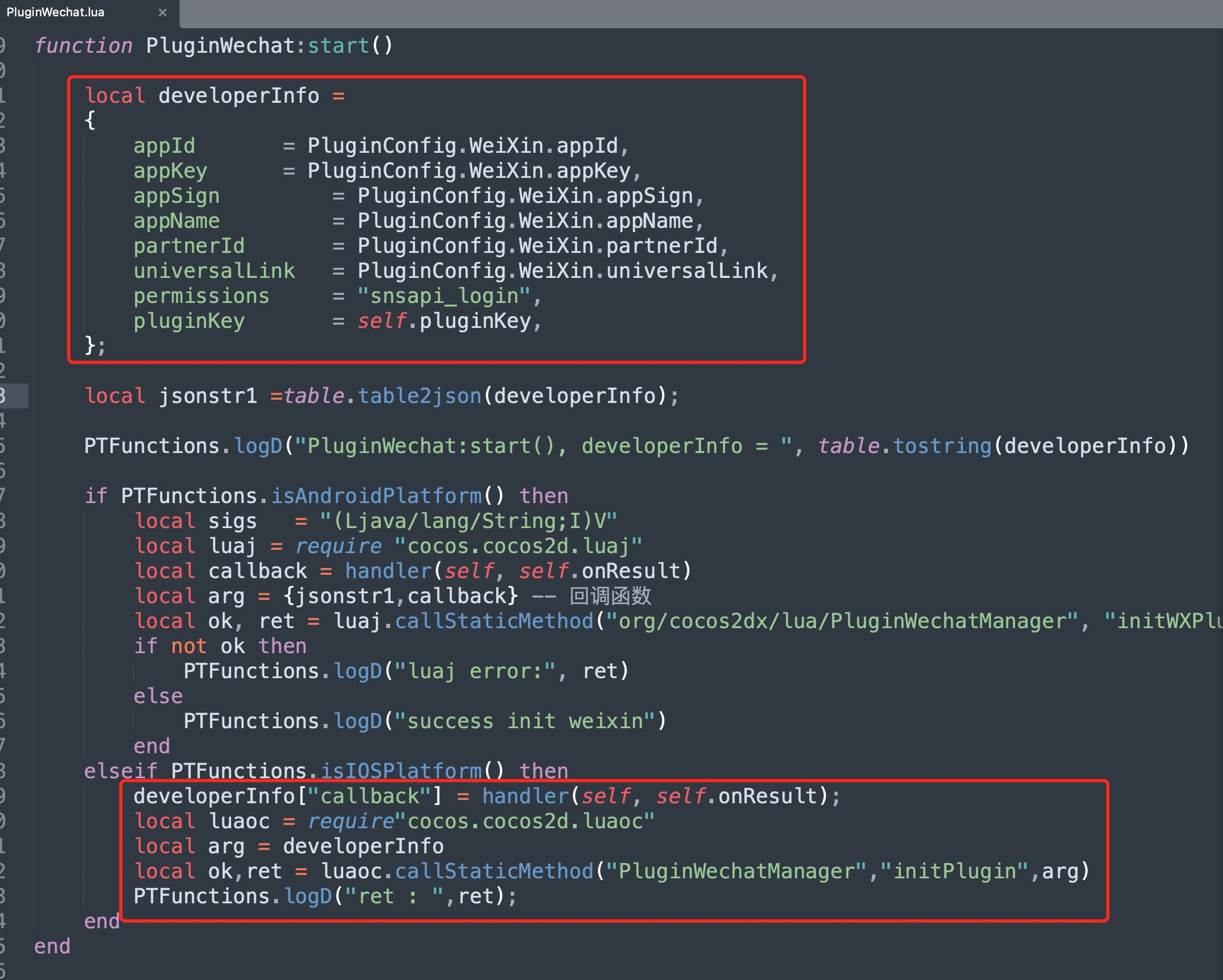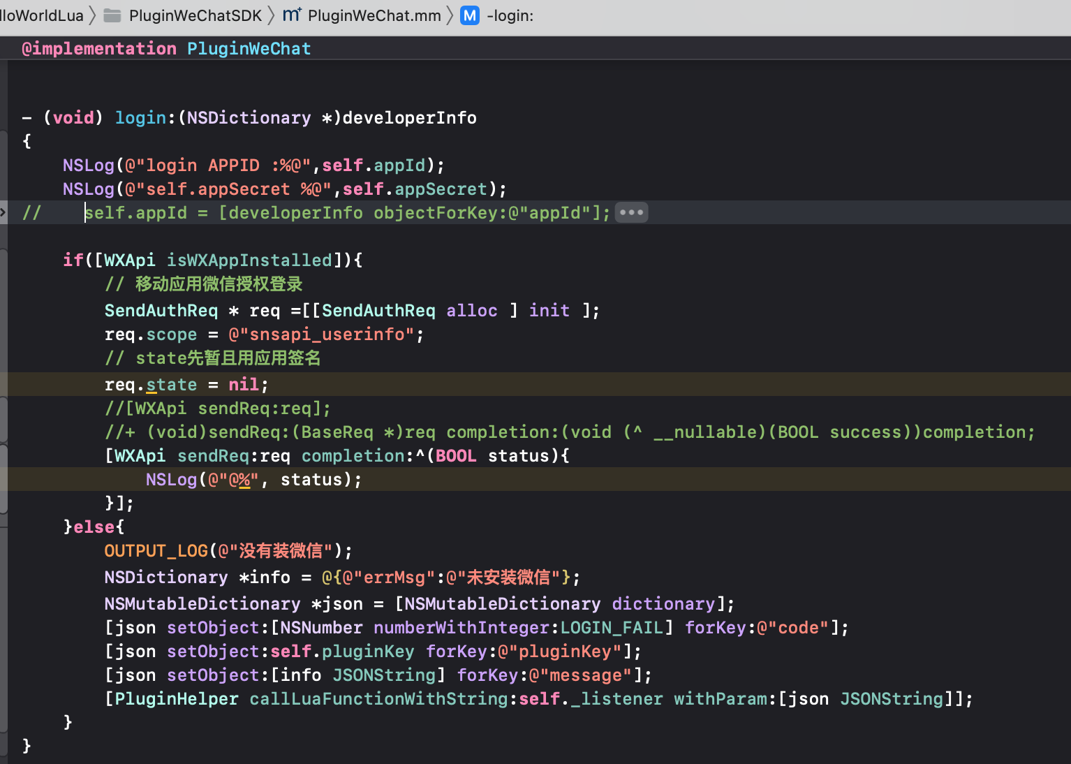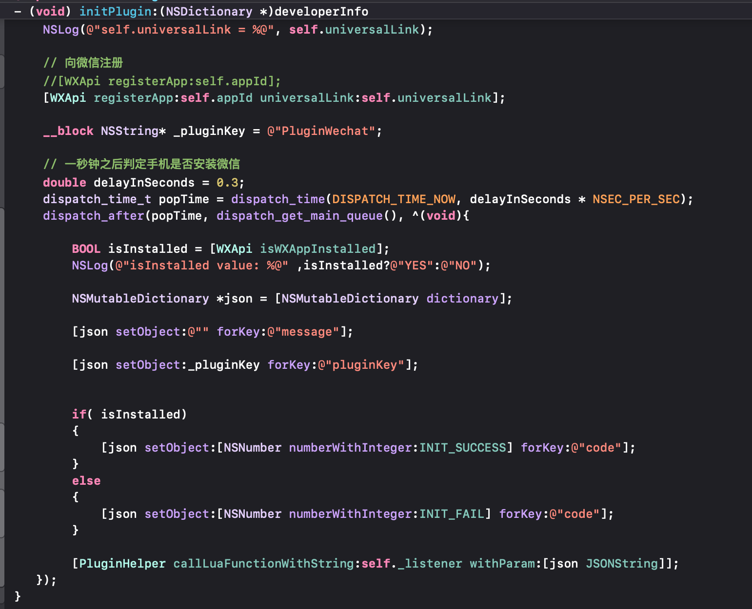 我在游戏的appcontrol.mm里通过微信单例调用initWeChatPlugin,实例化了PluginWeChat,LUA调用PluginWechatManager的initPlugin方法,该方法通过刚创建的实例调用内部的initPlugin(为动态方法),并且传递了相关从lua发过来的参数。