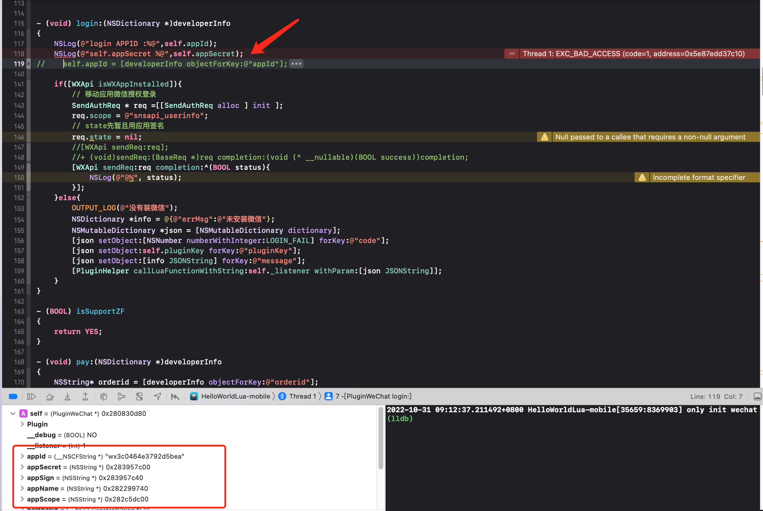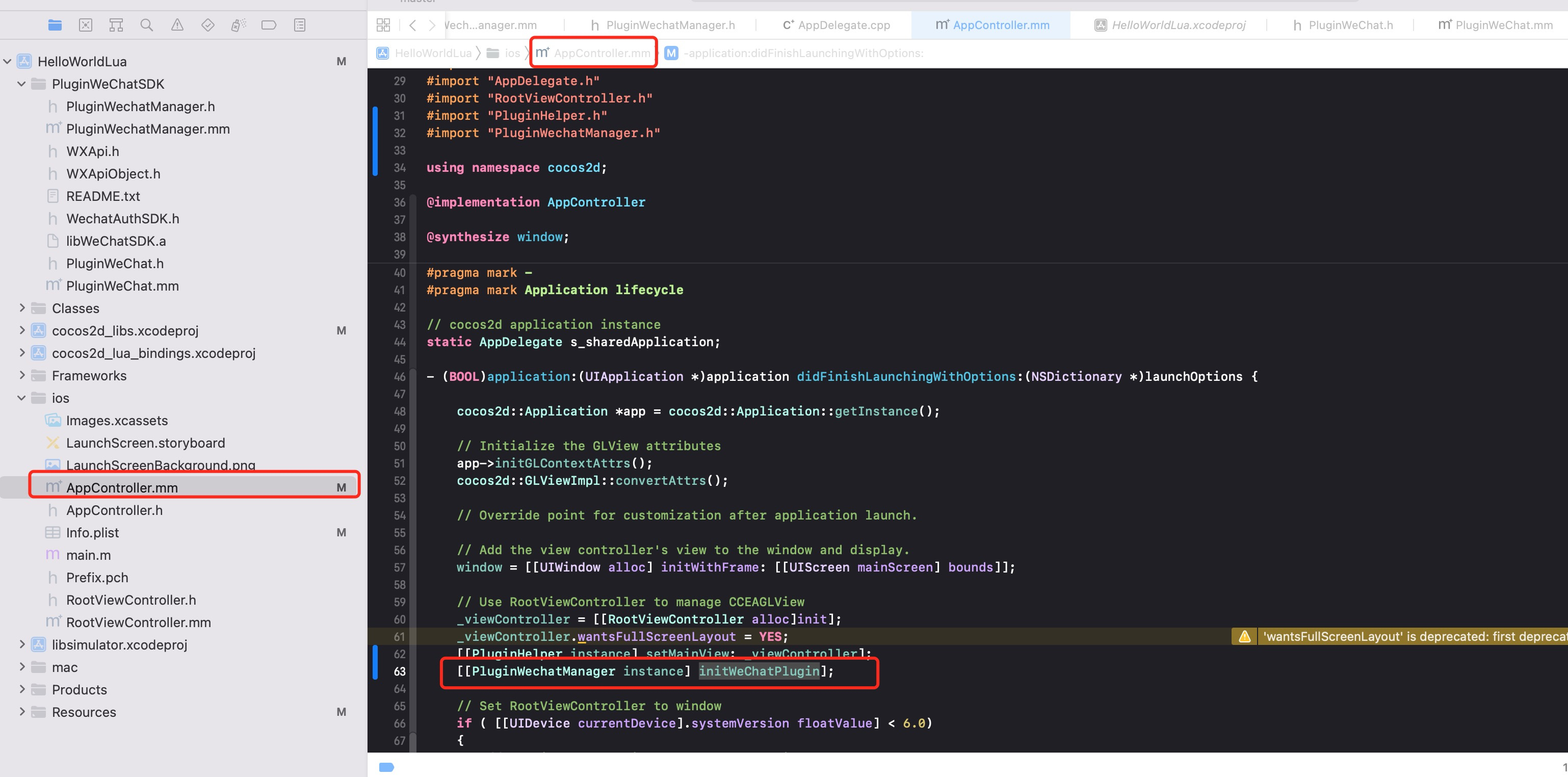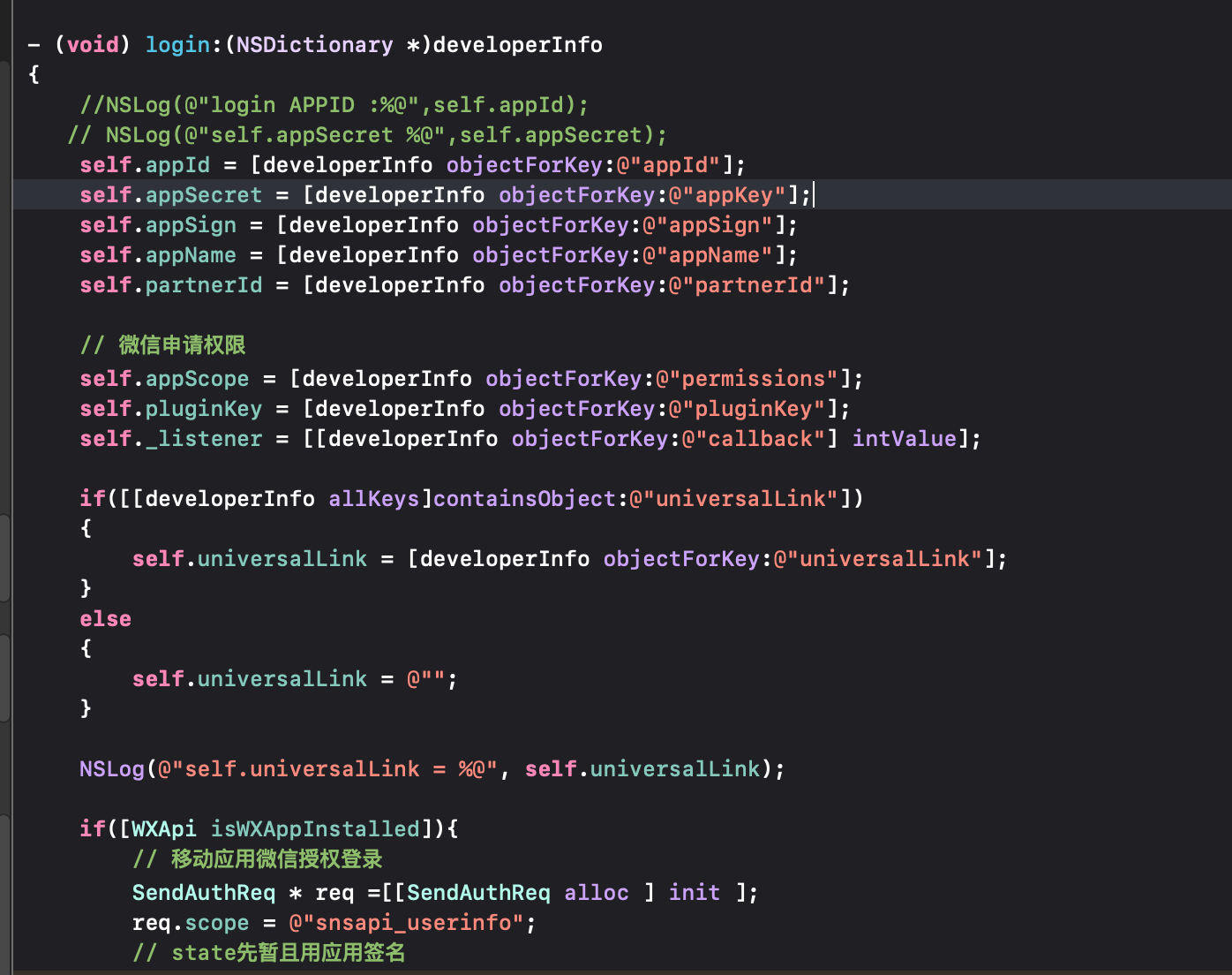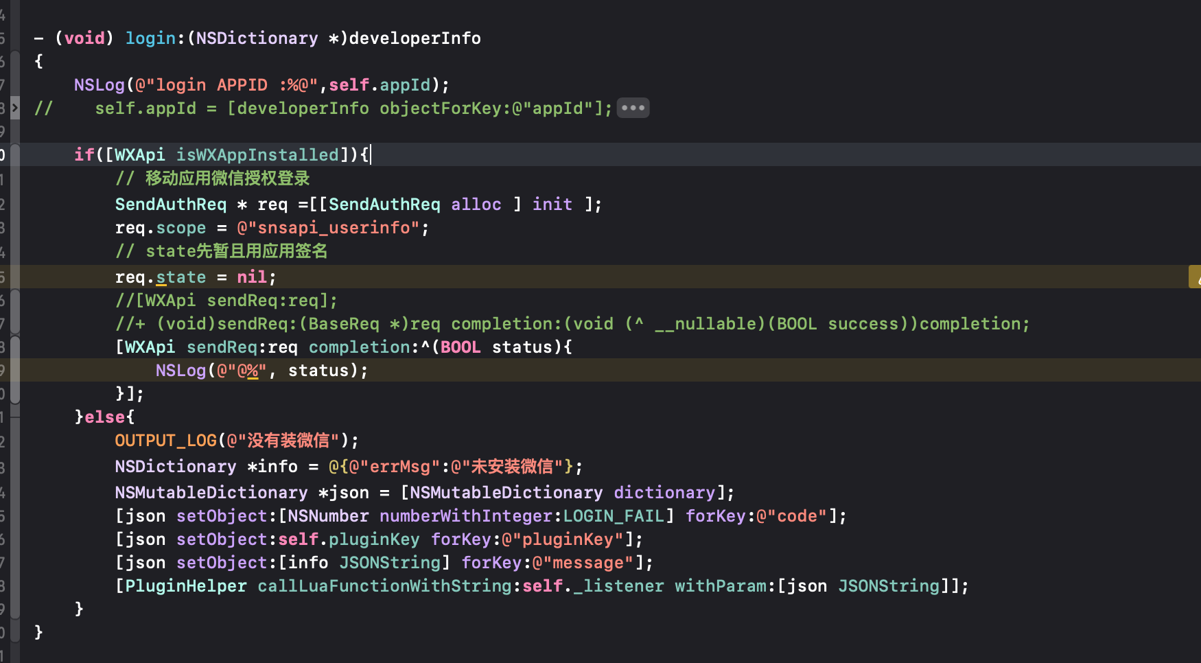 我在游戏的appcontrol.mm里通过微信单例调用initWeChatPlugin,实例化了PluginWeChat,LUA调用PluginWechatManager的initPlugin方法,该方法通过刚创建的实例调用内部的initPlugin(为动态方法),并且传递了相关从lua发过来的参数。