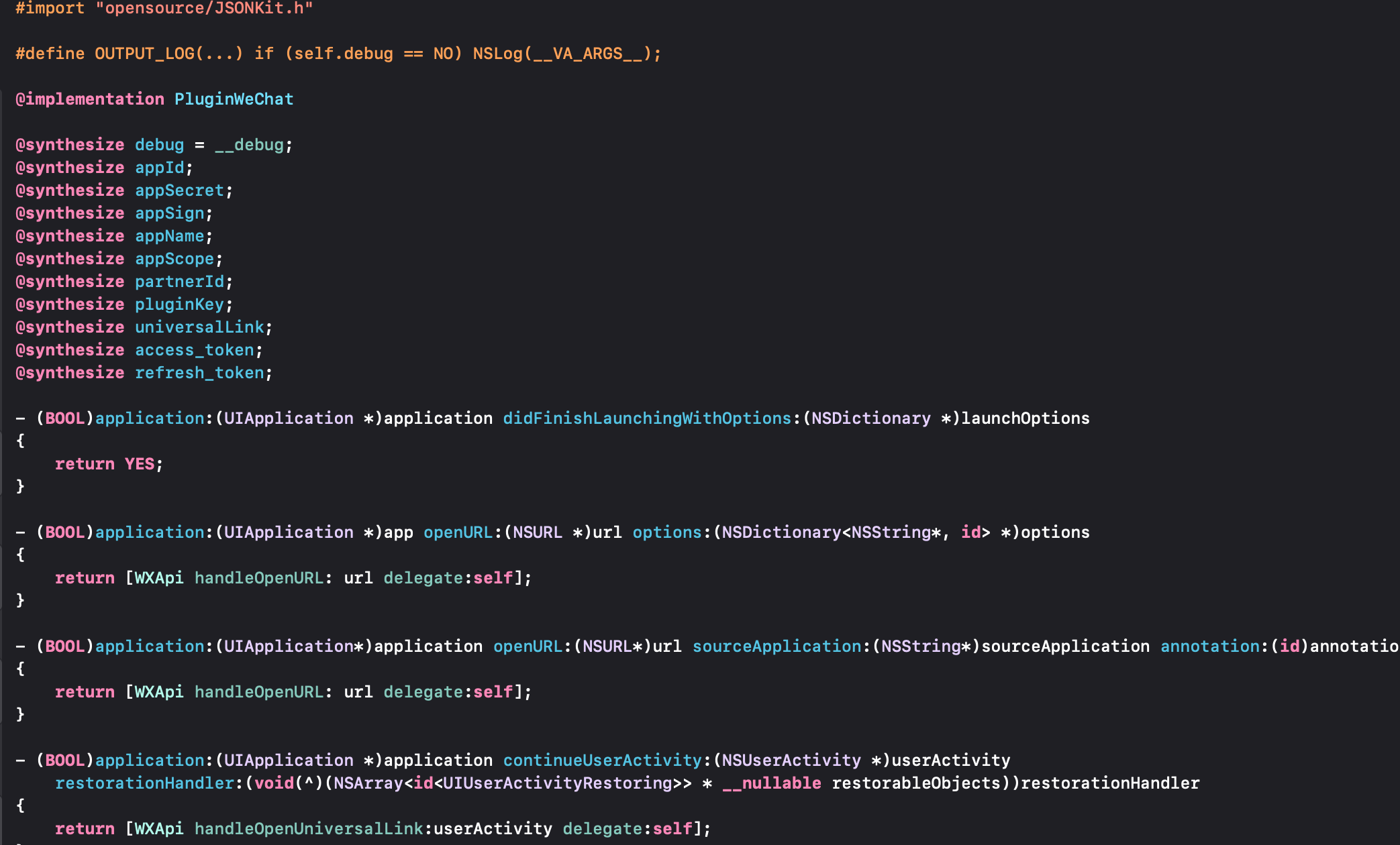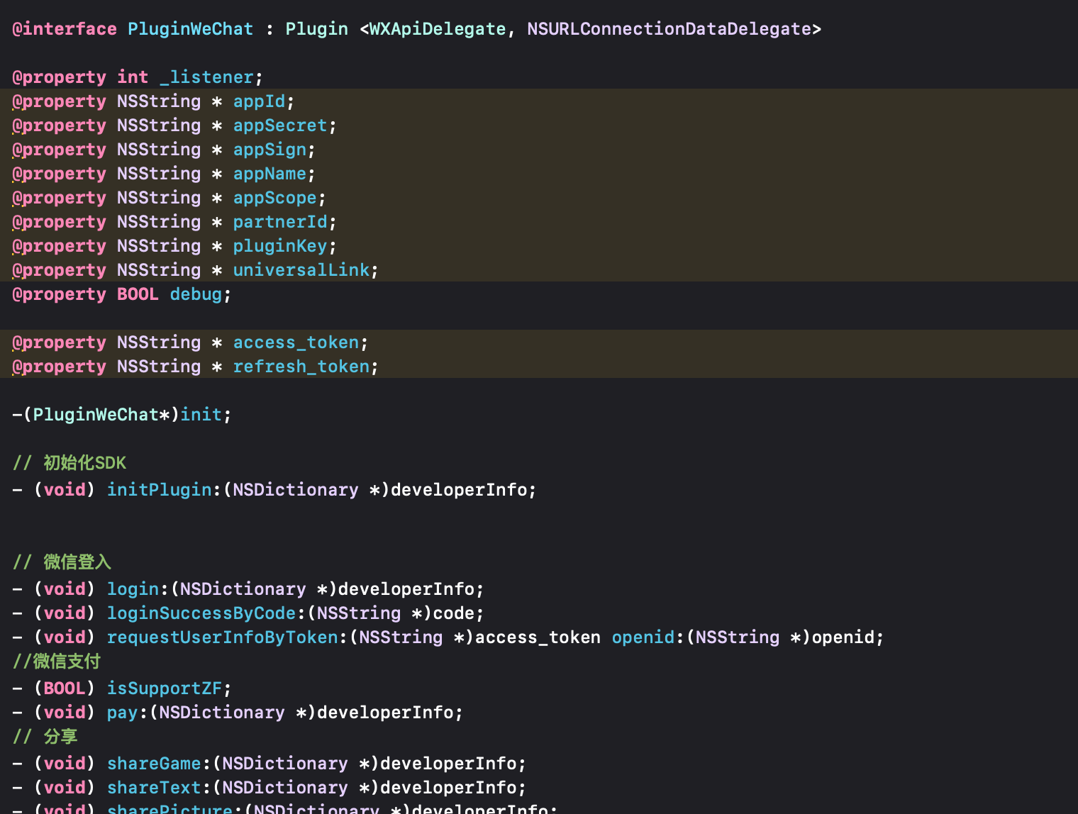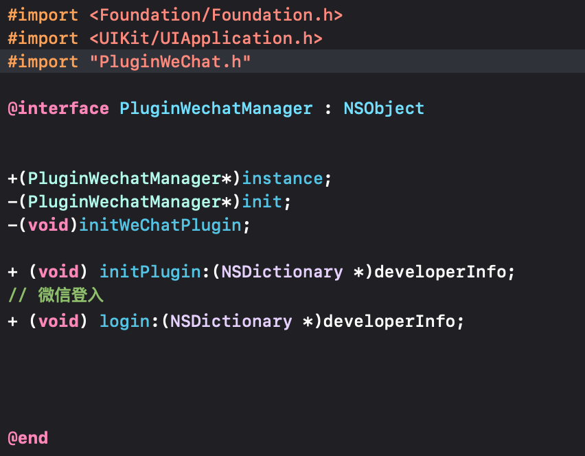 pluginWeChat继承plugin类,内部为动态oc方法。