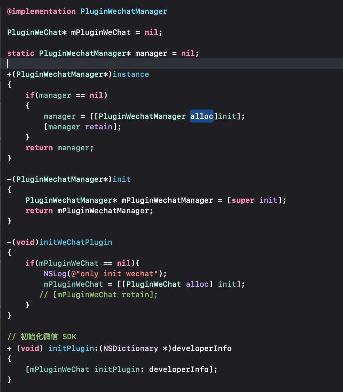 引用了一个SDK单例和微信管理器单例初始化微信的实例;其中PluginHelp是管理所有的SDK, PluginWetChatManager是管理微信SDK