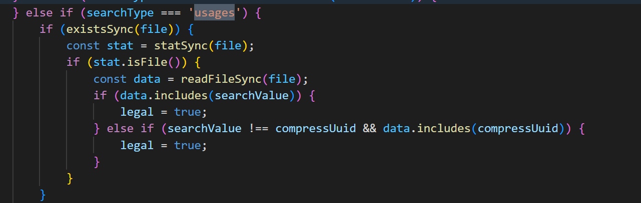 “查找uuid的使用” 目前编辑器的实现方案是先圈定几种会使用其他资源的资源类型,对这些类型的资源 assets 进行遍历,根据每个 asset.file 磁盘路径取文件的序列化数据,进行目标 uuid 的内容匹配。