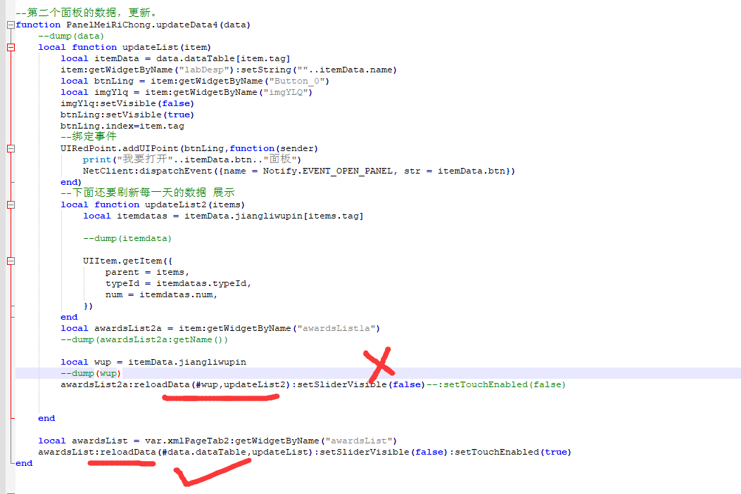 向我这样写,刷新了第一个列表,我还想在每一个列表中刷新一些数据,用了awardsList2a,但是提示attempt to call method ‘reloadData’ (a nil value)