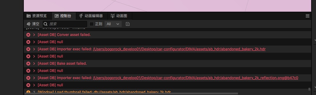 公司里只有一个同事的mac机报这个错误,目前来看也只有这一个hdr文件导入不进来。就算是新建的一个工程也是这么报错,从3.6.1报错升级了一下3.6.2。建新工程也导入不了hdr材质。hdr材质也找过其它的,也是导入不了,卡在这儿。