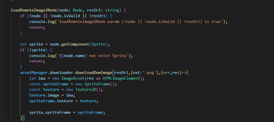 你这图片url也不对啊,至少前提你需要拿到能打开图片的url,一般是不带拓展名的,然后调用的时候补上后缀就行了assetManager.loadRemote(resUrl, { ext: ‘.png’ }, (err, asset: ImageAsset) => {});