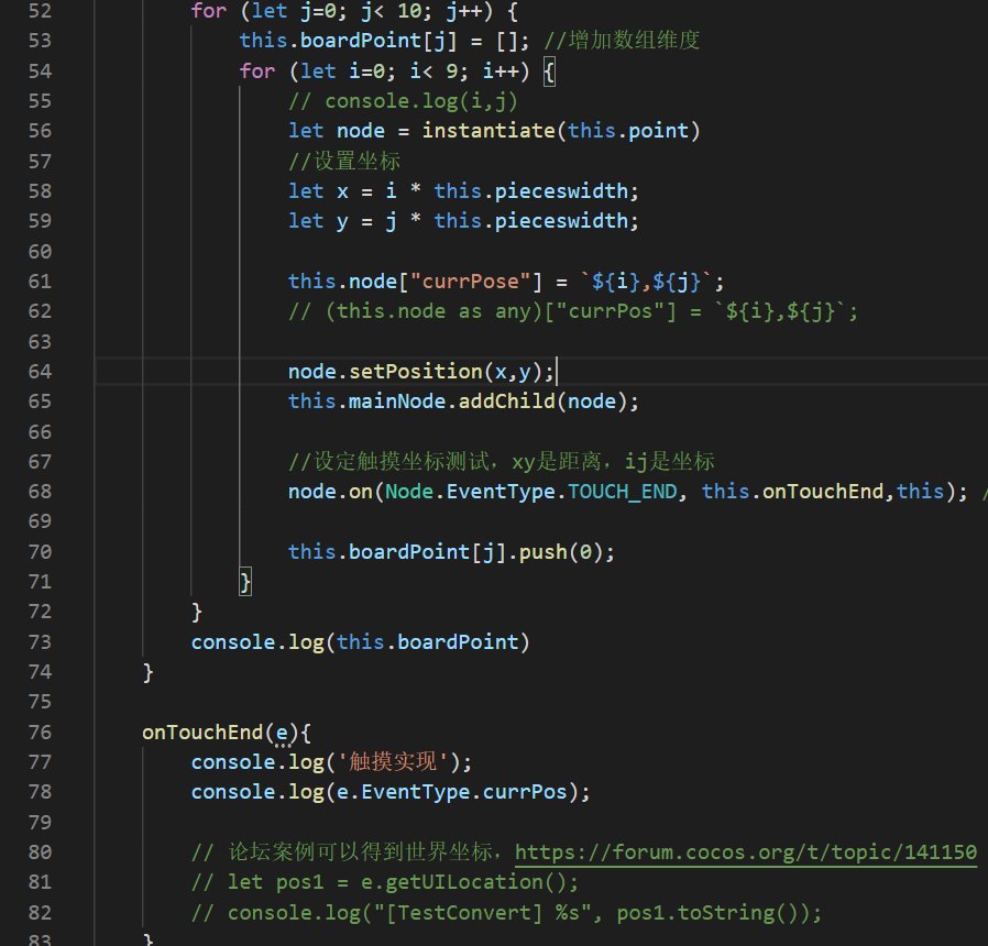 第56行的实例是一个预制件,希望用61行或62行的代码添加属性,把双层for循环的i、j值赋值给该属性——this.node[“currPose”] = ${i},${j}或 (this.node as any)[“currPos”] = ${i},${j},然后在第78行的触摸函数种进行输出。现在报错currPos未定义。参考方法来自该连接的方案3:https://forum.cocos.org/t/topic/140650,其余方案也还没看懂怎么用,在文档上没搜出相关方法——搜索关键字为“添加属性”、“增加属性”;也搜了一下typescript“添加属性”、“增加属性”,看到的内容都不如上方网站里的详细。先感谢大佬们的指点