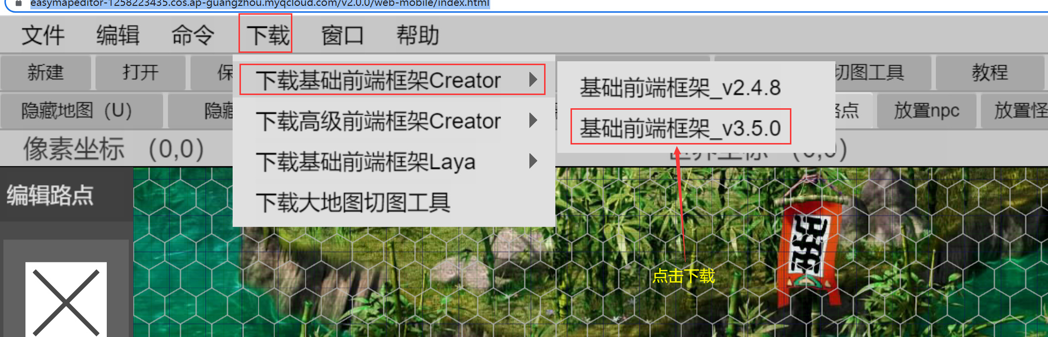 然后点击菜单 “下载” -> “下载基础前端框架Creator” -> “基础前端框架_v3.5.0