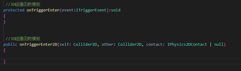 Unity的用法就简洁得多,只需在需要做碰撞回调处理的脚本添加如下图的函数就可以了