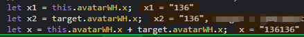 你断点的x1,x2值都有引号,avatarWH的输出xy值也都有引号,说明都是字符串了,字符串相加就是1+1=11