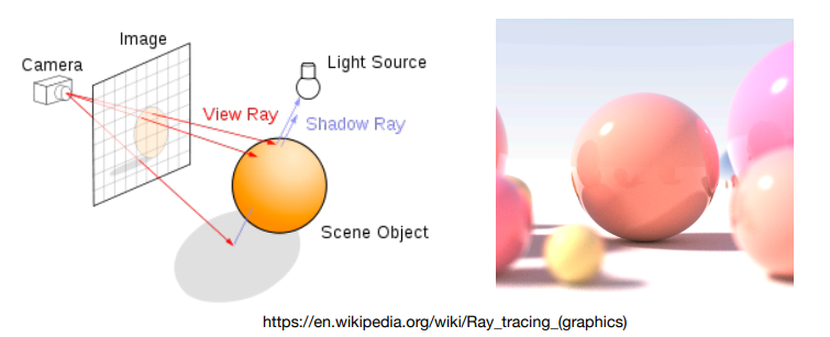- 从相机出发向每个像素发射射线 shoot rays from the camera through each pixel