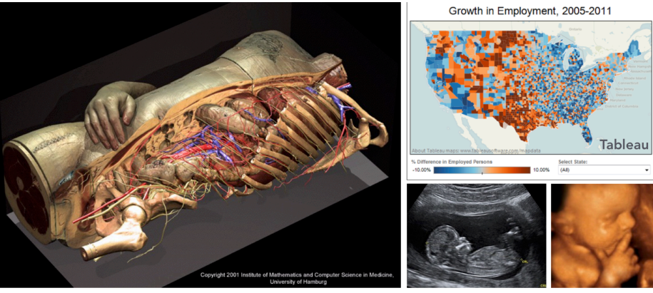 - example: 将核磁共振、超声波等仪器收集的信息经过处理转化,渲染为图形表示。现代计算机还结合AI对影像进行分析,辅助医生和患者诊断。