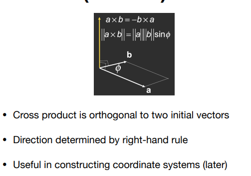 - 向量定义,向量的加法、叉乘、点乘、叉乘与点乘在图形学中的应用。点乘可应用于计算夹角与投影,叉乘可应用于判断点是否在三角形内部、向量的左右关系以及构建正交坐标系,