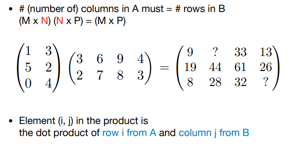 - 例子:以第1行第4列的13为例,从第一个矩阵中找第1行(1,3),第二个矩阵中找第4列(4,3),进行点乘,1 * 4 + 3 * 3 = 13