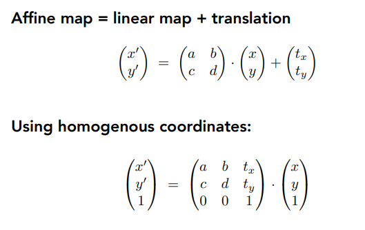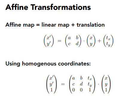 在齐次坐标下,abcd表示线性变换矩阵(缩放、反转、切变、旋转),tx和ty则表示平移变换(非线性变换),齐次坐标用一个矩阵统一了所有操作。