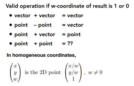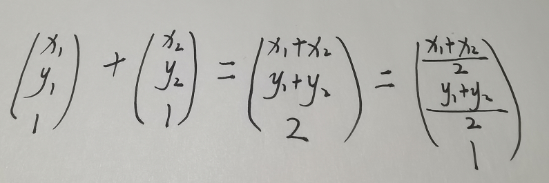 point+poing结果为两点的中点, - 因为:对于任何的点(x,y,w)可以通过整个点除以w得到(x/w,y/w,1)**,