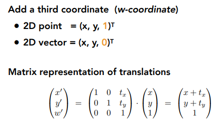 无法写成上述统一的矩阵形式,特殊处理不利于计算,因此使用齐次坐标解决。