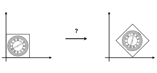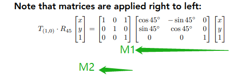 应用变换矩阵,应从右往左计算(左乘),如下图先旋转45度得到M1,再平移得到M2