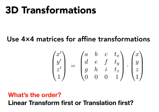 - 顺序 :与二维一致,先应用线性变换,再平移