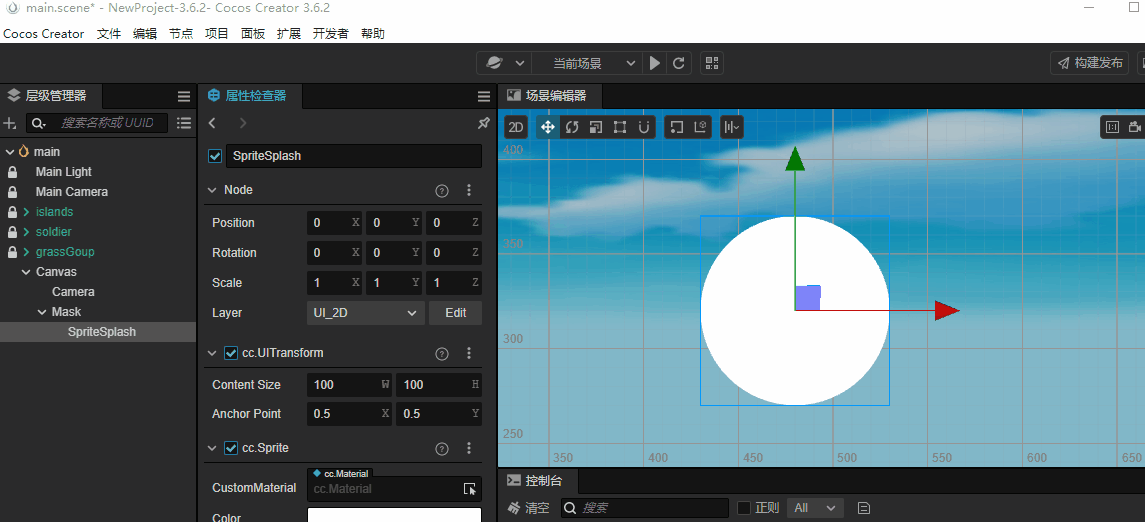 按照正常理解Mask子节点的SpriteSplash往右移动,是显示圆的左半边