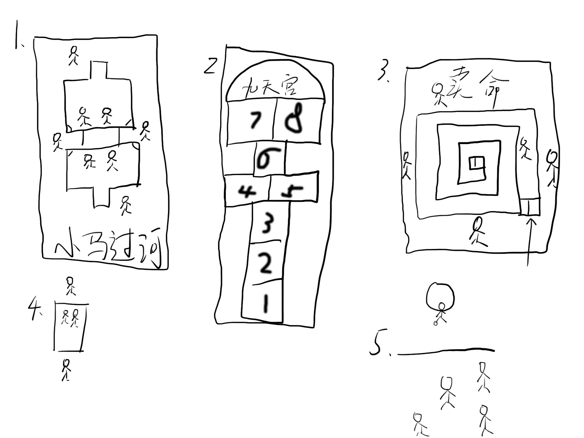 2022年的最后一个工作日,跟几位要好的同事打算摸鱼,寓意明年年年有余,大家就聊起了童年时候跟小伙伴一起玩过的有趣的小游戏,我分享了一些我小时候玩过的游戏给大家,我本身是北方人,同事中南方人偏多,我发现有一些游戏好像南北方是一致的,只是名字不一样,今天又看了一篇回忆童年的文章,于是又感慨了一番,把我玩过的一些记忆比较深刻的游戏画了出来,顺便简短的介绍一下游戏规则: