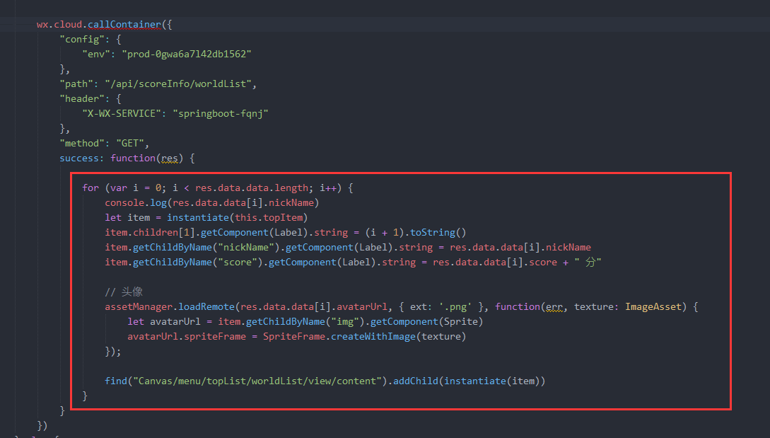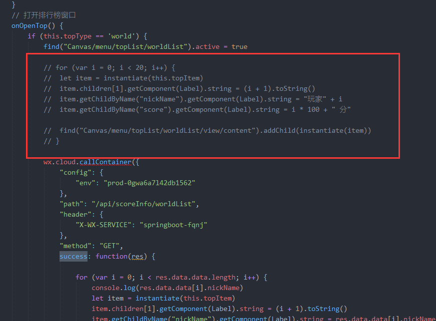 这里是根据 wx.cloud.callContainer 返回的值渲染排行榜数据,但报错如下错误,是可以正常获取到返回的值,如“养乐多”。