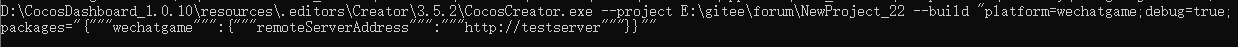 “C:\CocosDashboard_1.1.1\resources\.editors\Creator\3.5.2\CocosCreator.exe” --project …\ --build “platform=wechatgame;outputName=wx_mailiang;md5Cache=true;mainBundleCompressionType=merge_all_json;replaceSplashScreen=true;startScene=2dc911ce-d4d6-48d1-952c-464785e5e3db;scenes={2dc911ce-d4d6-48d1-952c-464785e5e3db,c3932ade-b9dd-4ec1-9127-3319abd38bd0};startSceneAssetBundle=true;orientation=Portrait;remoteServerAddress=https://qcdn/remote;”