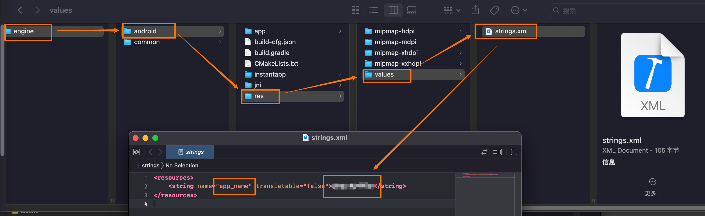第二步是,【native】——>【engine】——>【android】——>【res】——【values】——>【strings.xml】,将 app_name 后面的字符串内容,由【项目英文名称】,更改为自己要使用的【APP汉字名称】