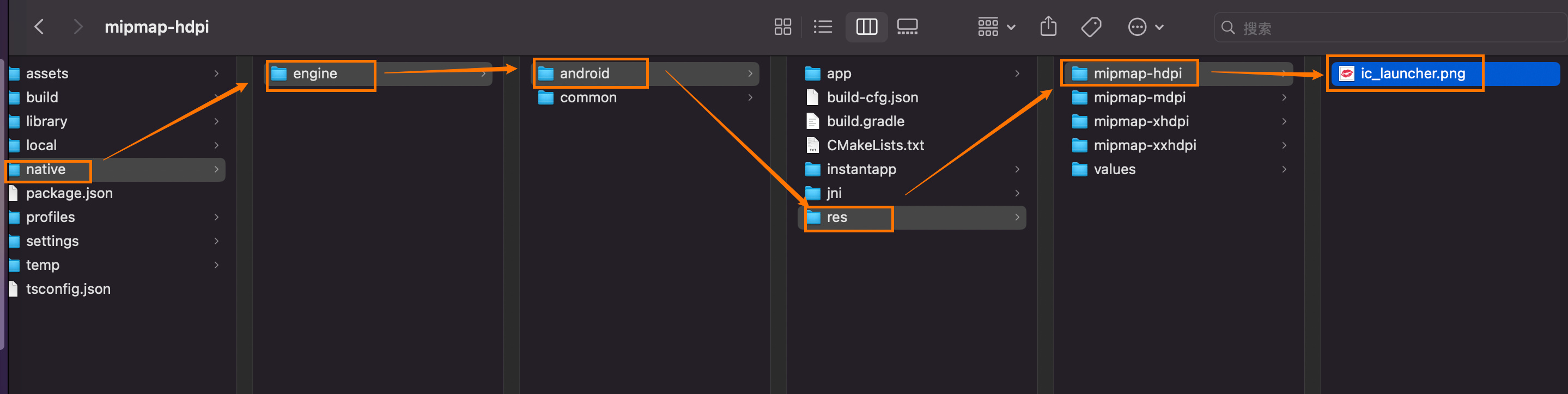 第一步是,打开【native】——>【engine】——>【android】——>【res】——【mipmap-hdpi / mipmap-mdpi / mipmap-xhdpi / mipmap-xxhdpi 四个文件夹】——>【ic_laucher.png】,将这四个文件夹里的 ic_laucher.png 图片,都换成另一个 png 图片,换掉的 png 图片,必须满足两个要求,第一个要求是大小,图片的格式必须是 png,图片大小必须是几十Kb,如是不是几十KB,而是几MB的话,那么生成安装包时,会报错,第二个要求是,图片必须重新命名为原先的名字,不能私自更改图片的名字