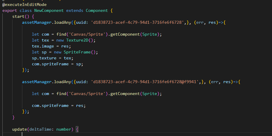 Editor模式下,获取到了资源的uuid,使用assetManager.loadAny({uuid: uuid})方式挂载Sprite的图片,可以显示,但Sprite上的spriteFrame属性没有挂载上,估计是loadAny获取的资源是imageAsset类型的问题,2.x使用的cc.loader.load获取的是spriteframe,请问3.6下应该怎么处理脚本挂载图片?