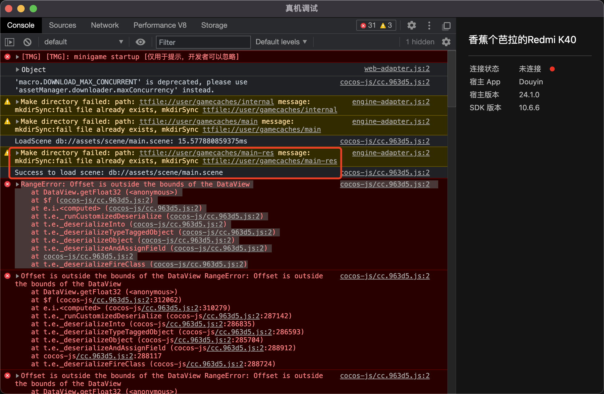 日志中可以看出 远程包 main-res 已经加载了 里面的文件格式后缀均是json,png,mp3,ttf,下面这个报错却不知道是什么文件引起的问题