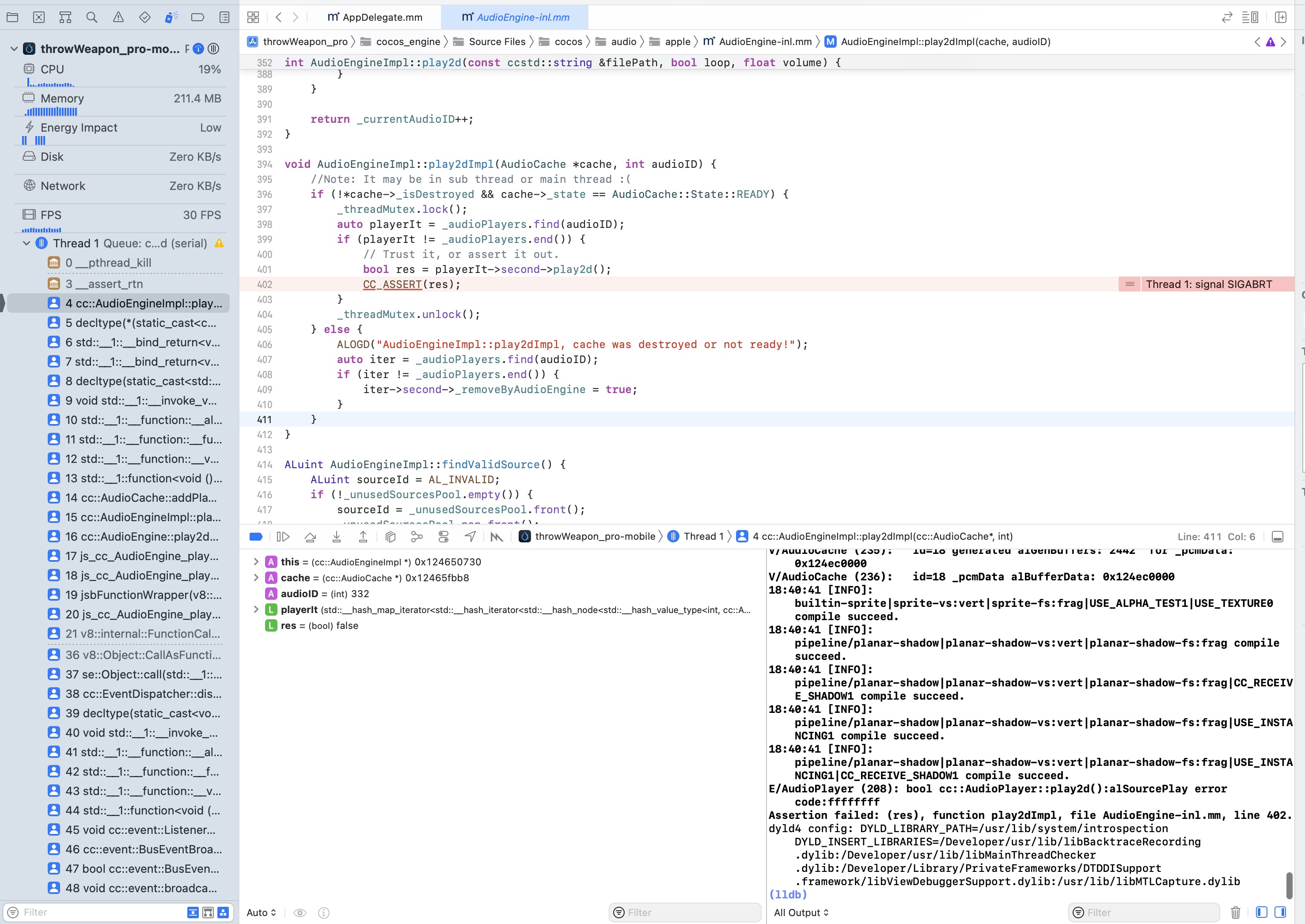 Assertion failed: (res), function play2dImpl, file AudioEngine-inl.mm, line 402.