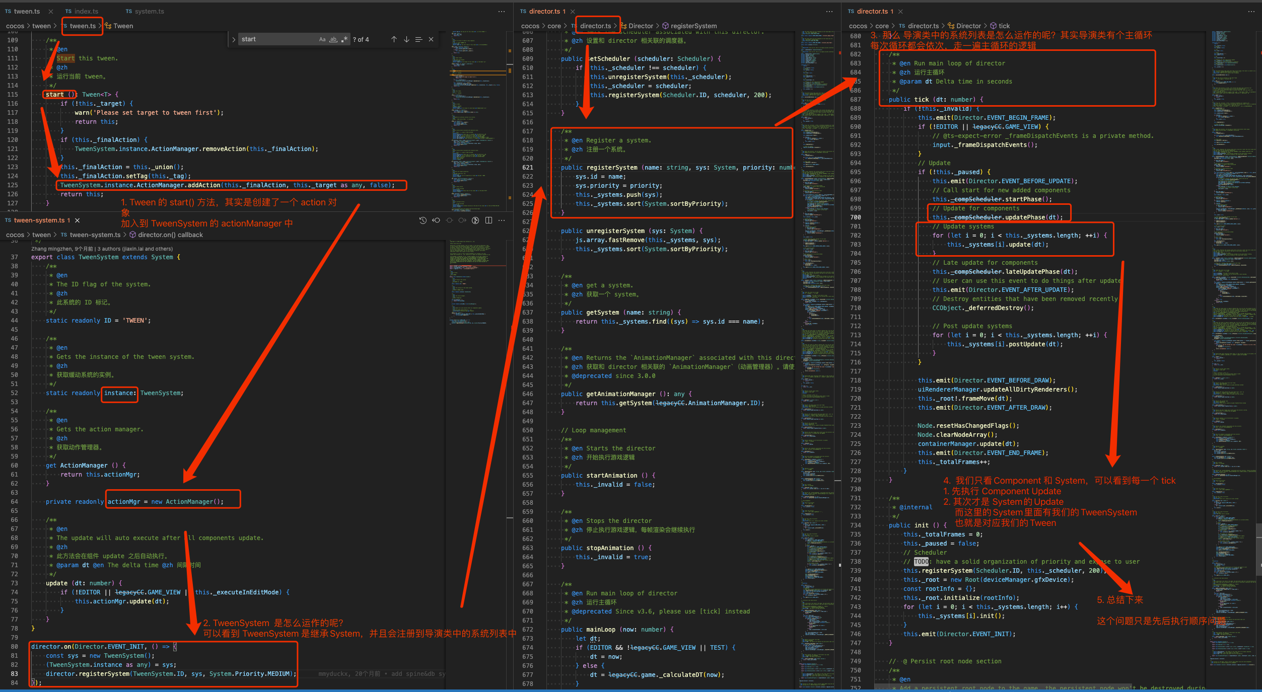 如果一个物体从A点位移到B点,有两种方式:1、使用Tween进行位移;2、在update中每帧设置位置。