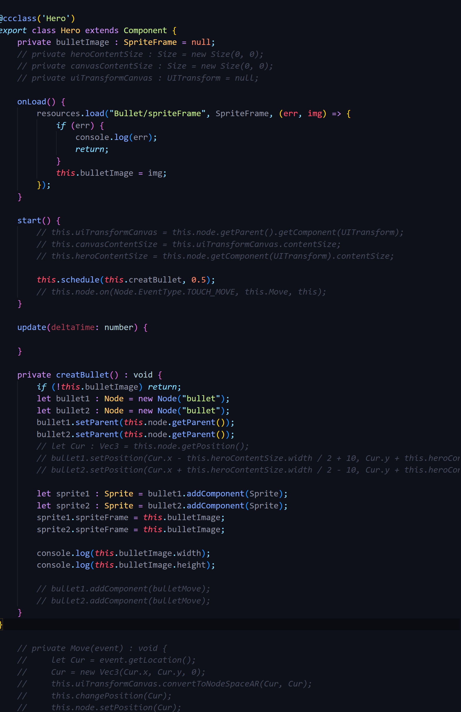 我把这个脚本挂在了Canvas下的一个节点Hero上,这个节点的父亲节点就是Canvas,通过resources加载一张图片当作创建节点中精灵组件的图片帧。之后设定了一个计时器,每次创建两个节点,将这张图片挂在这两个节点上。但是除了第一次输出图片的宽高是正常的之外,到了第二次以后输出的图片帧的宽高都变成了2048,真的不知道是哪里出了问题。