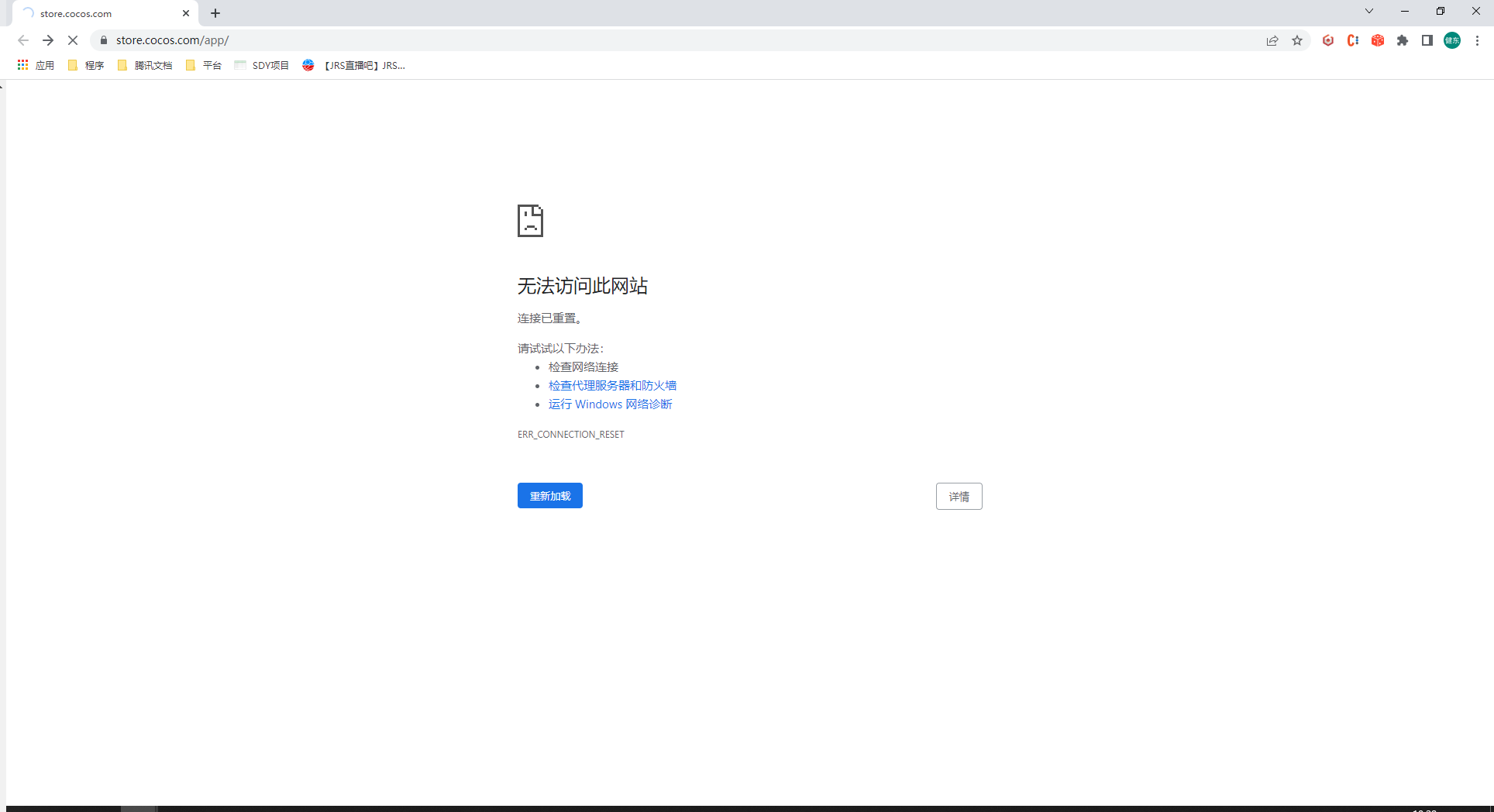 抱歉 Cocos Store 给你带来的不好体验! 经过测试发现,如果是打开了科学上网,会导致Cocos Store商店出现无法访问的情况。 如果再次遇到问题,可以先检查是否使用了科学上网,建议暂时关闭。