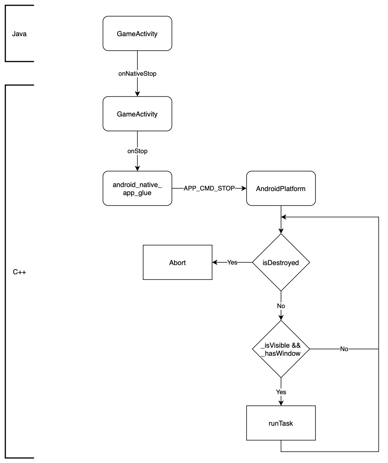 Java层GameActivity将Stop生命周期回调通过JNI调用到C++层GameActivity的onNativeStop到android_native_app_glue里的onPause,android_native_app_glue通过Pipe管道将APP_CMD_STOP事件从主线程切换到游戏的主线程,将事件传递给了AndroidPlatform,并且AndroidPlatform则把_isVisible修改成false。