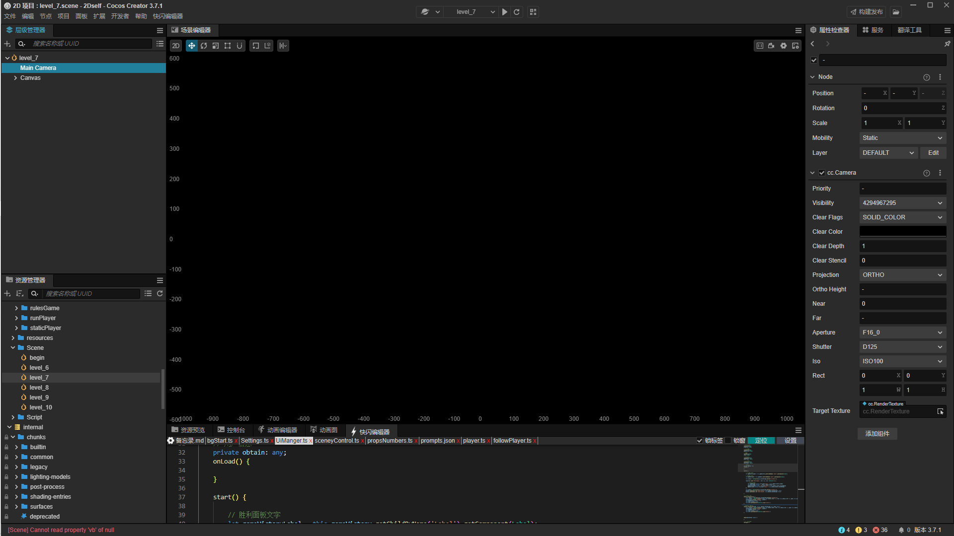 切换到level_7场景,切换其它场景也有同样的问题Scene.zip (17.3 KB) ,然后老是保留上一张照片,要么黑屏,要么卡在上一个场景了,点击摄像机也显示不出来画面。先谢谢了