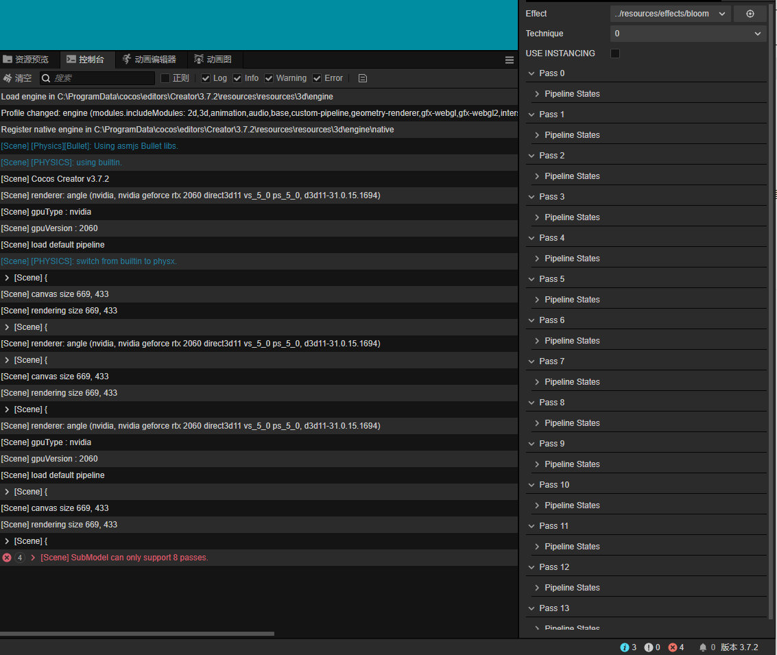 下载了CocosCyberpunk升级到3.7.2的工程,将pipeline复制到extensions文件下,打开就会有个报错,大概看了一下,有一个bloom 的材质,里边有 14pass,但是源码中超过8个就报错,然后return了,都return了,那就是设置失败了,那这个材质的意义在哪。 主要的问题就是 报错报错报错报错…,作为一个有强迫症的人,让我很揪心