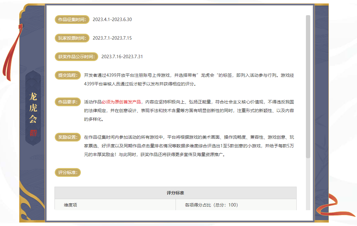 与征集令不同,4399小游戏“龙虎会”活动主要分为两个参与时间段,一个是作品的征集阶段,开发者们的作品需要在活动期间内上线4399小游戏平台,且参与的产品须为原创首发产品;另一个时间段则主要是玩家参与投票的环节,活动将根据4399平台审核人员及玩家投票的情况评选出1至5款创意的小游戏,不仅奖金丰厚,还将获得更多宣传及海量资源推广!