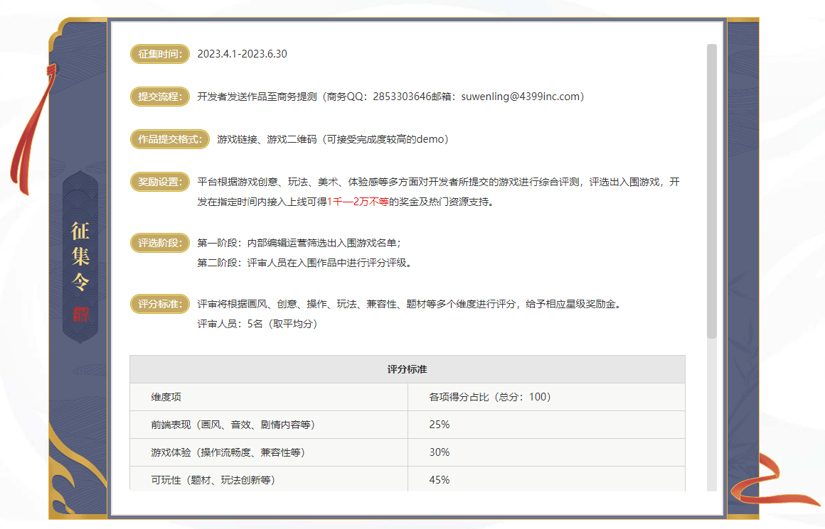 4399小游戏征集令将针对所有优秀的H5小游戏开发者,不限地域,不问出身,不拘帮派,只要开发者们身怀绝技,自认小游戏开发功力深厚,皆可揭榜应召,将作品发送至指定QQ:2853303646或邮箱:suwenling@4399inc.com。